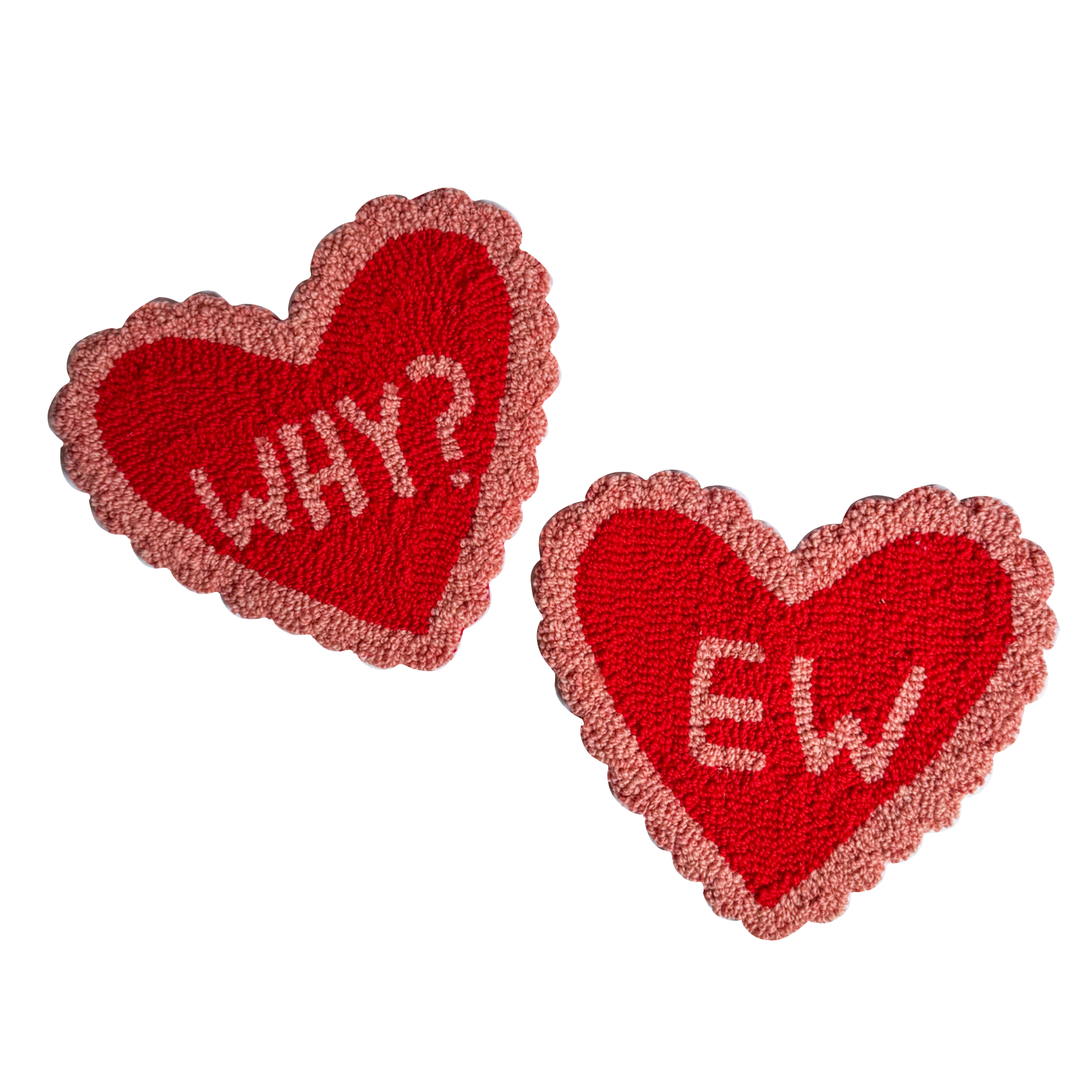 These sassy valentines wall hanging is handmade with a loop-pile tufting machine, using 100% maritime wool yarn and backed with adhesive and felt. There is a d-ring attached to the back for easy hanging on a nail or picture hook.