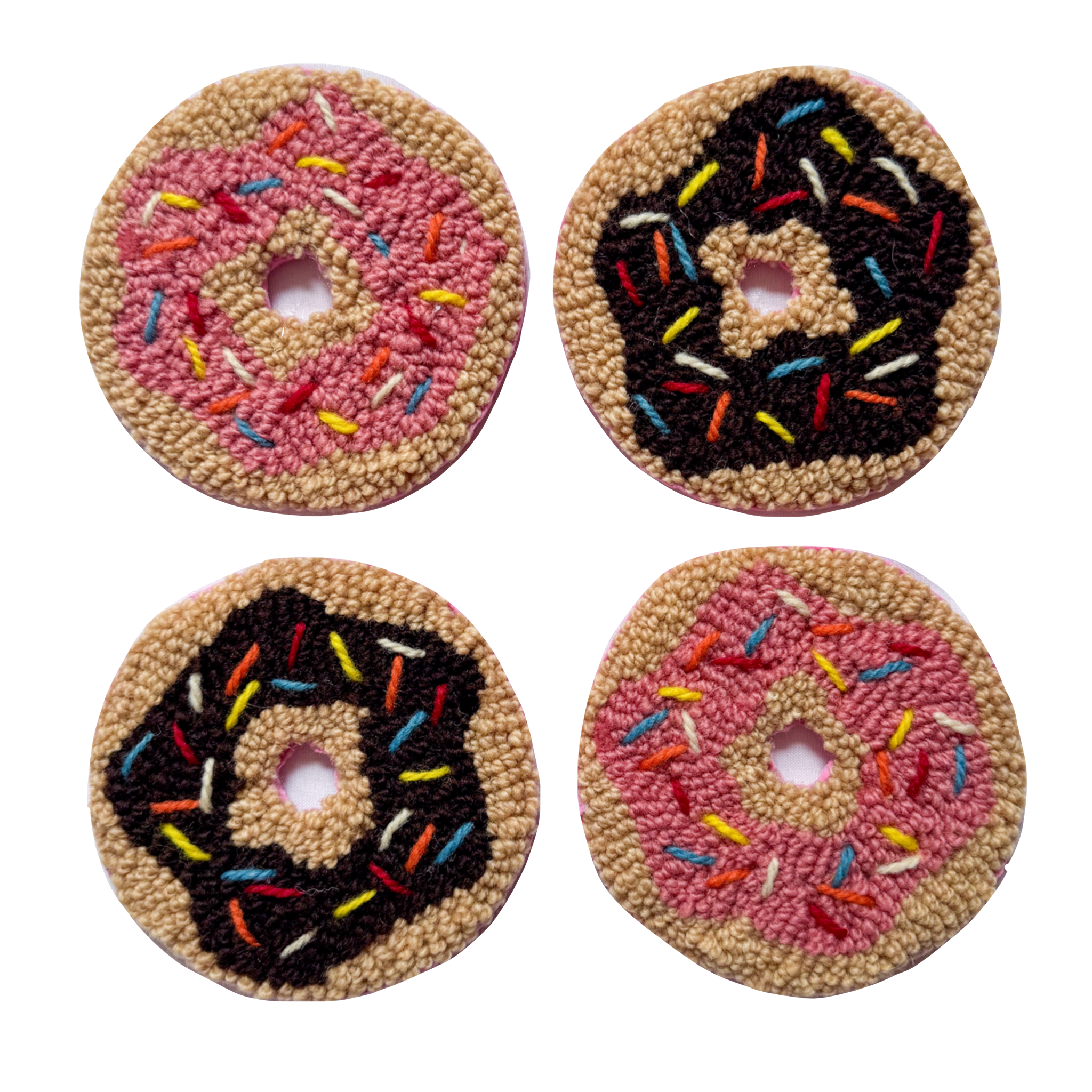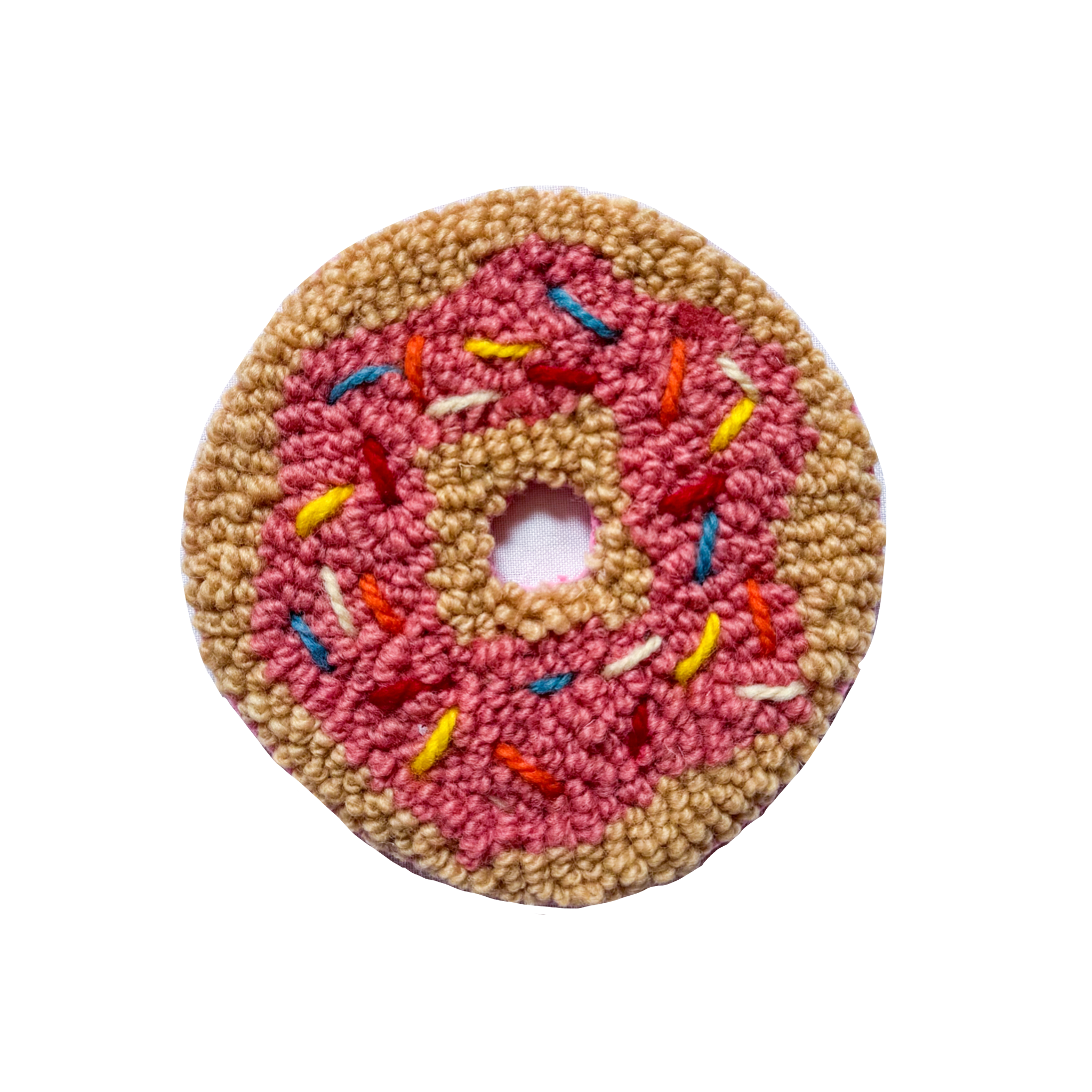 This coaster is handmade with a loop-pile tufting machine and hand stitched sprinkles, using 100% wool yarn and backed with adhesive and felt (the colour of felt backing may vary from photo.)