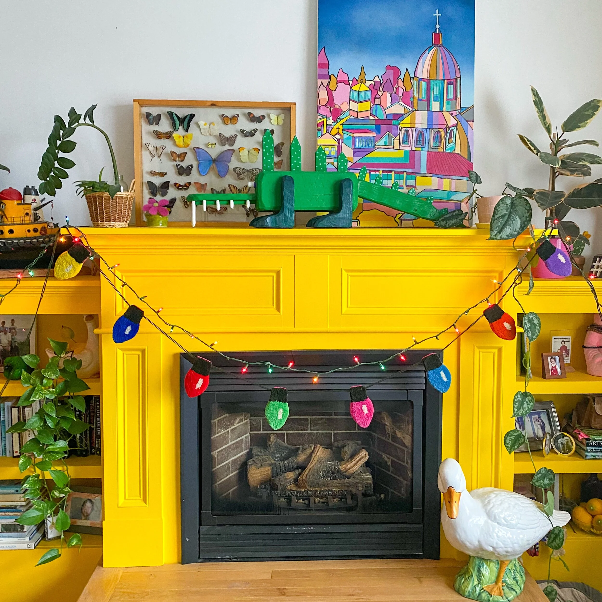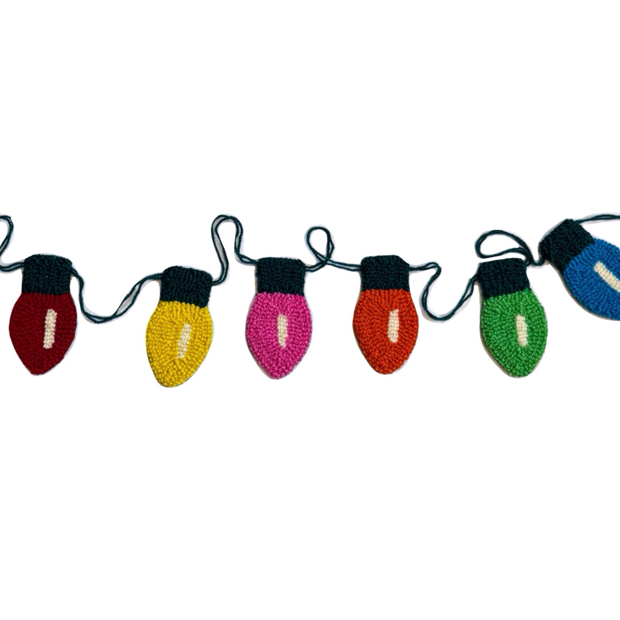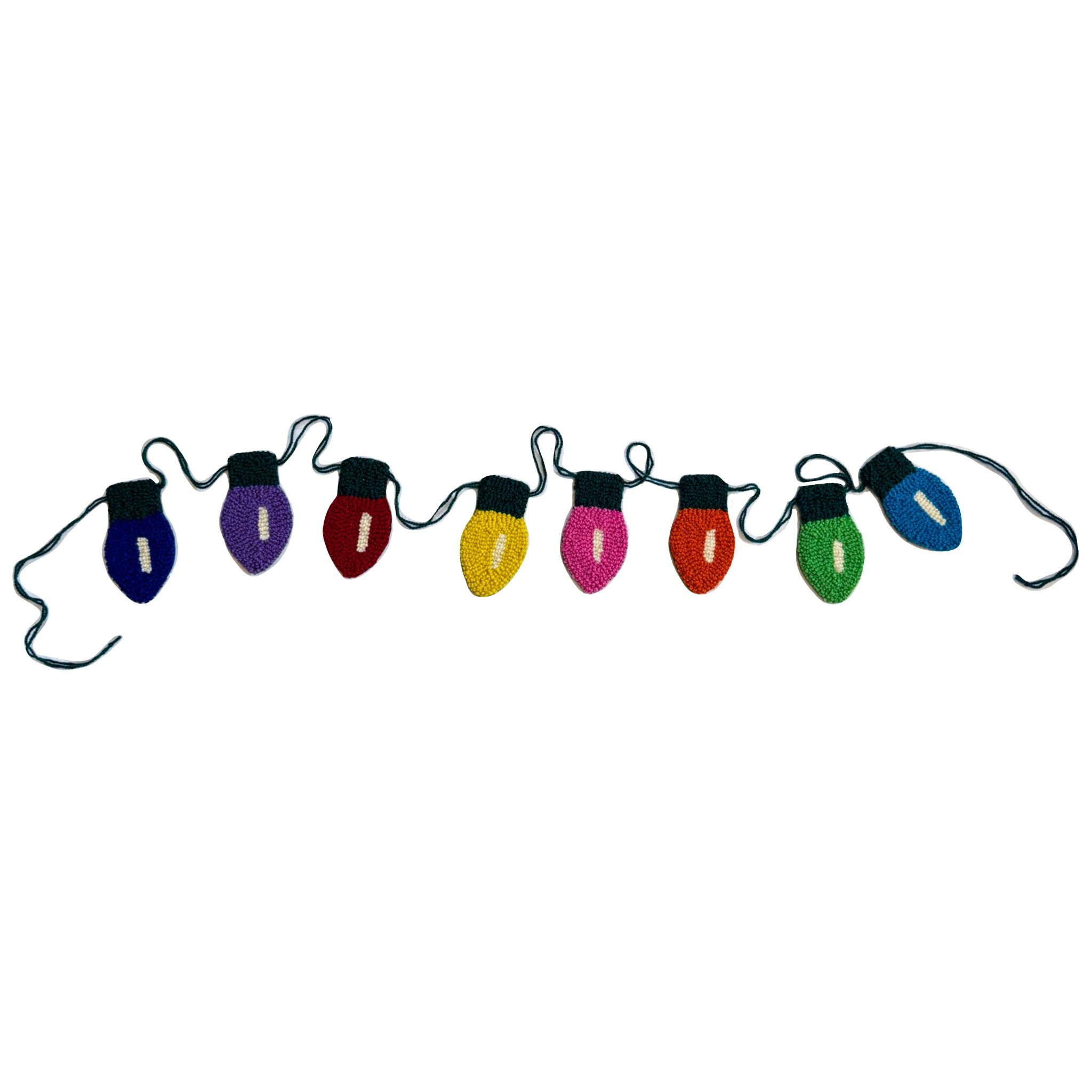 These tufted string slights are handmade with a loop-pile tufting machine, using 100% wool yarn and backed with adhesive and felt. There are 8 bulbs per string and each bulb measures 3 by 5.5 inches. There is an 8 inch space between each bulb and the entire string measures approximately 88 inches in total. The order and colours of the bulbs may vary.