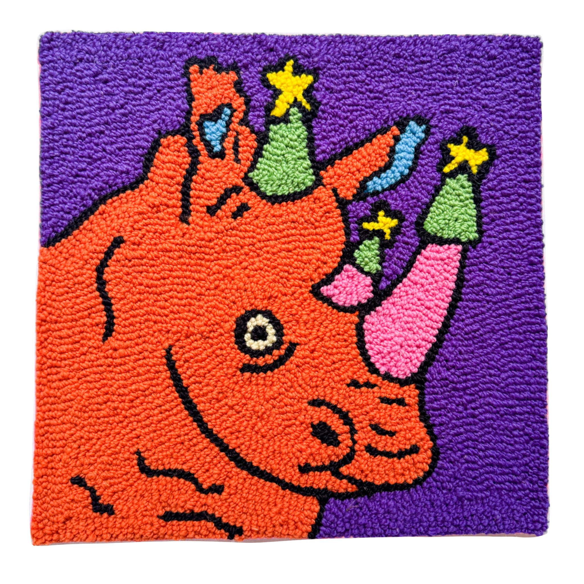 This rug is handmade with a loop-pile tufting machine, using 100% wool yarn and backed with adhesive and felt. There are two d-rings attached to the back for easy handing on nails or picture hooks.