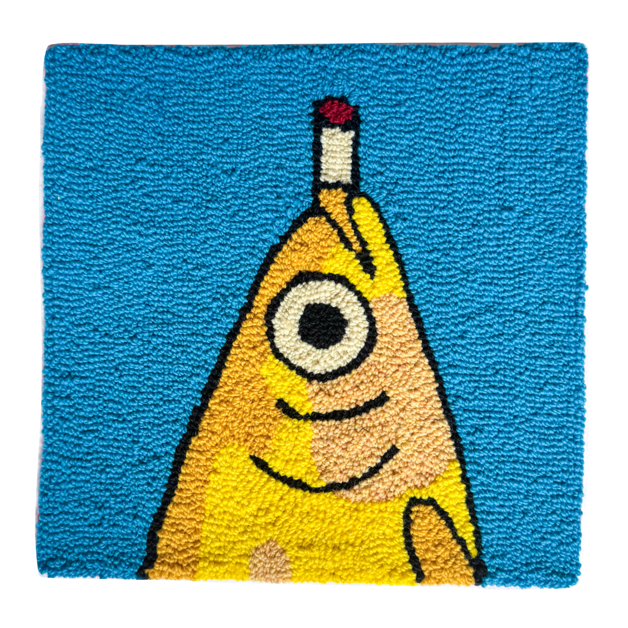 This rug is handmade with a loop-pile tufting machine, using 100% wool yarn and backed with adhesive and felt. There are two d-rings attached to the back for easy handing on nails or picture hooks.